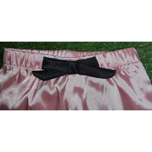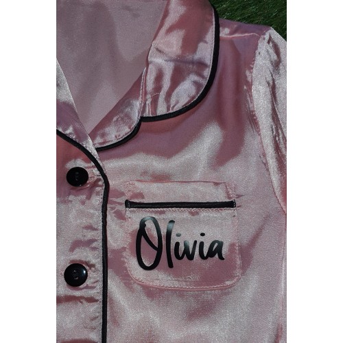 Our beautiful soft pink satin, pyjamas are accented by black piping detail and a dinky bow on waist. The button up top ensures a secure closure while making it easy to get dressed. With elastic-waistband these pyjamas are so comfortable. Perfect as a gift!